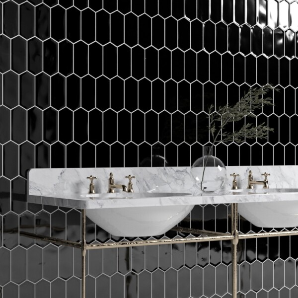 Picket tiles are a fun alternative to traditional hexagon or subway shapes. Their elongated form adds movement and rhythm, especially in black and white. Try using them as a backsplash or feature wall behind the vanity.