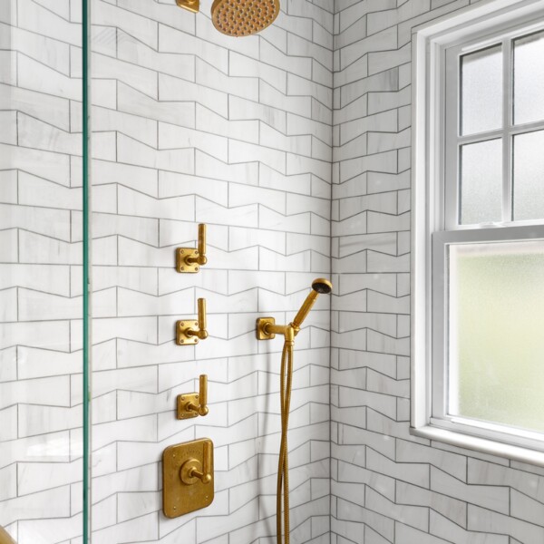 For a glamorous spin on the black and white look, incorporate gold accents through lighting, faucets, or mirror frames. Pairing retro-inspired tile patterns with metallic finishes brings vintage bathrooms into the modern era.