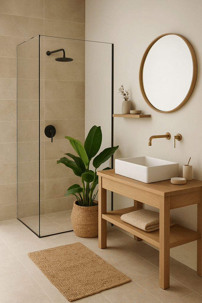 Matte or honed finishes on black tiles further soften the overall ambiance. Integrate light wood elements, soft linen towels, or potted plants to add natural warmth. This subtle layering keeps the space minimalist but not cold.