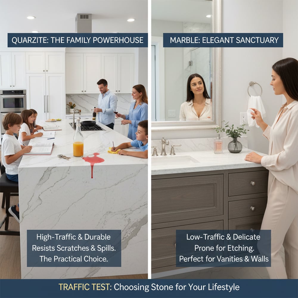 For high traffic areas like a main kitchen or a primary bathroom, the choice usually leans toward the most durable material. If you have a busy household with kids or love to host dinner parties, the quartzite vs marble debate is often won by quartzite. Its ability to resist the common hazards of daily use, from dropped keys to spilled wine, makes it a more practical companion for a hectic lifestyle.