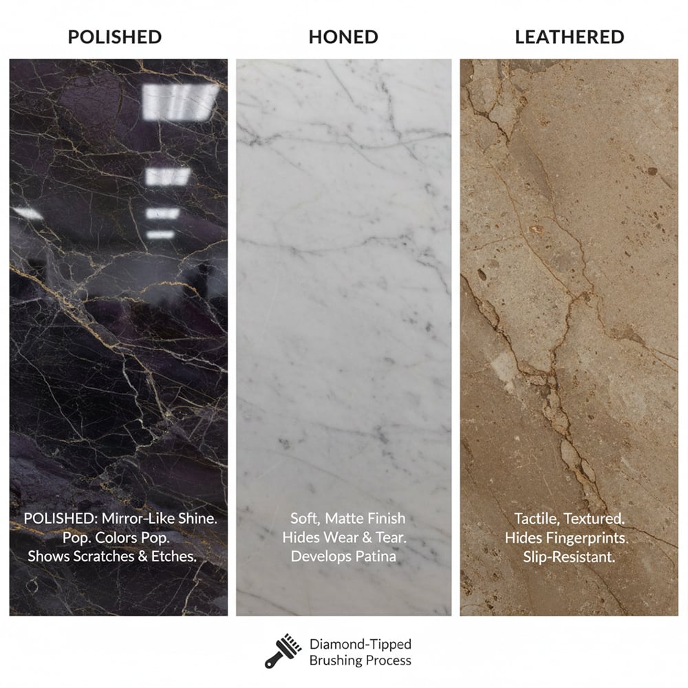 The finish you choose for your countertop can significantly affect its performance. A high polish creates a mirror like shine that makes the colors pop, but it also makes etch marks and scratches more visible, especially on marble. Many homeowners choose to hone their marble countertops. This creates a matte, velvety surface. A hone finish is excellent at hiding the wear and tear of aging and makes the inevitable patina look more intentional.