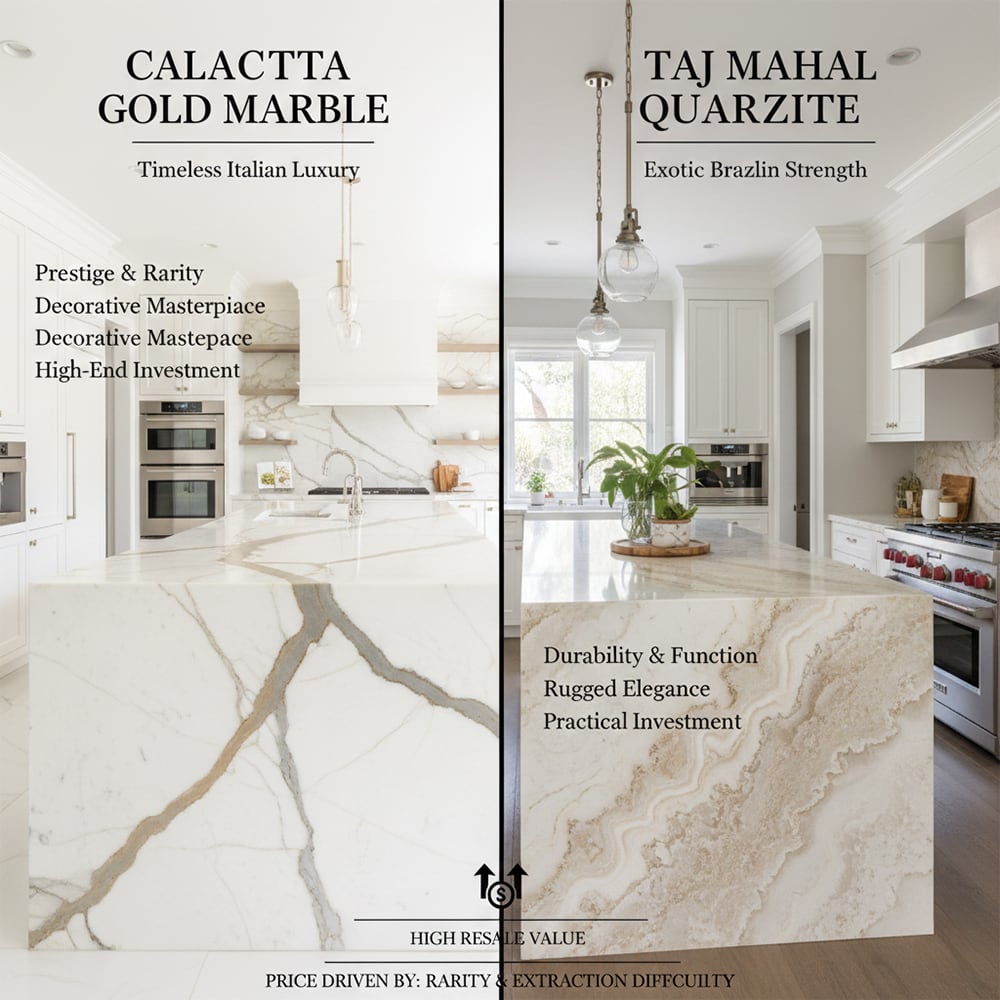 Both stones represent a significant investment. While granite used to be the default for high end homes, quartzite and marble have taken over the top spot for those seeking a specific aesthetic. Choosing between them often comes down to whether you value the prestige and history of a Calacatta marble or the functional strength and exotic beauty of a Taj Mahal quartzite.